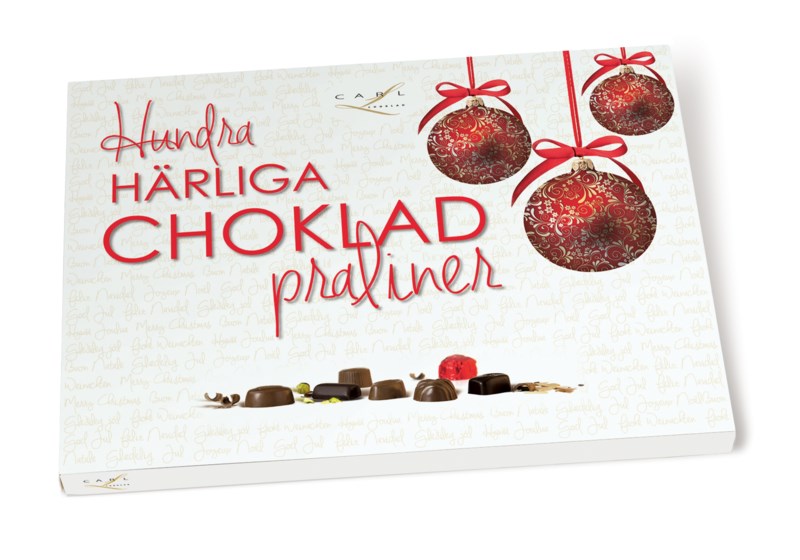 En ask fylld med 100 härliga praliner; gräddtryffel, kanelpraliner, mandelnougat m fl. Mixad sortering med mörk- och mjölkchoklad.