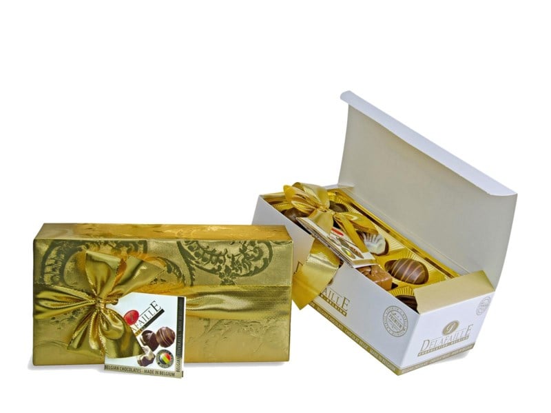 Belgiska praliner med härliga fyllningar i en mix av mörk-, vit- och mjölkchoklad. Inslagen med guldpapper och guldband.