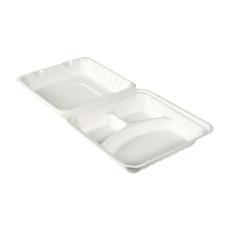 Mealbox med två fack och vidhängande lock. Boxen är tillverkad av det förnyelsebara fibermaterialet bagasse, och är komposterbar. Tål uppvärmning i mikrovågsugn.