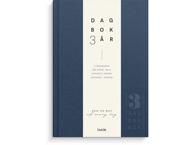 Dagbok som sträcker sig över tre år, årsneutral. Cremefärgat, syrafritt och åldersbeständigt papper. Följ vad som hände samma dag olika år. Plats för vädernoteringar. – Format: 142×205 mm. – Layout: Dag/sida. – Omslag: Linnetextil. – Inbunden. – Detaljer: Märkband. – Innehåll: Årsplan, namnsdagsregister. – Antal sidor: 384. – Pappersvikt: 100 g. – Miljöinformation: FSC® papper.