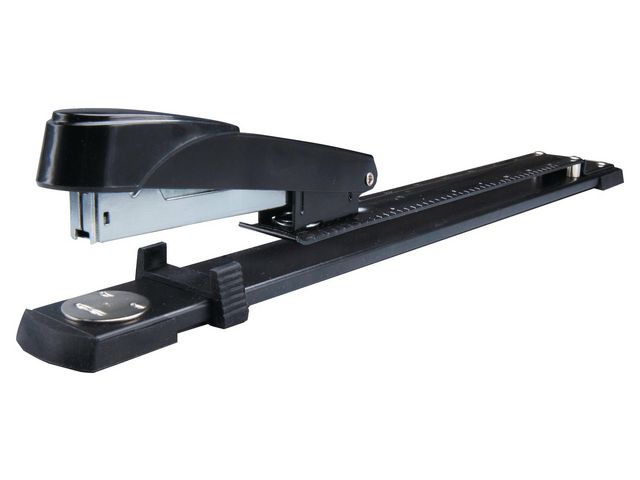Mångsidig häftapparat med lång arm i hög kvalitet. Bas av gummi som säkerställer stabilitet och skydd. Möjlighet till centrerad häftning. – Mått: 41 x 4,8 x 54,3cm – Material: ABS, metall – Kapacitet: 40 ark – Klammer: 24/6 och 24/8