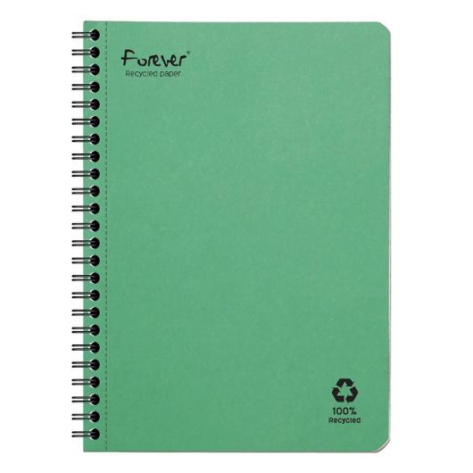 FOREVER premium, 100 % återvunnet papper i en trådbunden notebook. Anteckningsblock A4 60 löstagbara mikroperforerade ark kvadratiska 5×5 gröna. Djupt färgat återvunnet pressboardskydd. – Premium satinfinish – 90gsm vitt återvunnet papper – Certifierad FSC Recycled – Tillverkad i Frankrike