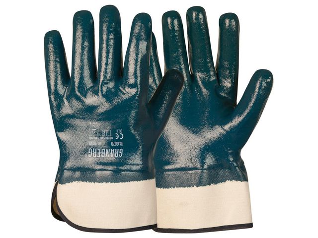 Lämplig till tungt arbete inom transport, underhåll, industri, anläggning, avfallshantering och sanering i smutsiga miljöer. Handskarna är heldoppade med slitstark nitrilöverdrag och gummerad manschett. Speciellt lämpliga för grovt arbete i torra arbetsmiljöer där det finns stor risk för nötningsskador. Nitrilbeläggningen ger ett bra skydd mot smuts och olja, men greppet är allra bäst på torra ytor. – Godkänd enligt: EN 388:2016+A1:2018, EN ISO 21420:2020 – Foder: Bomull – Doppningsmaterial: Nitril – Doppningsmetod: Hel beläggning – Grepp: Torrgrepp – Längd: 26 cm – Färg: blå – Storlek: 10 – CE-märkt