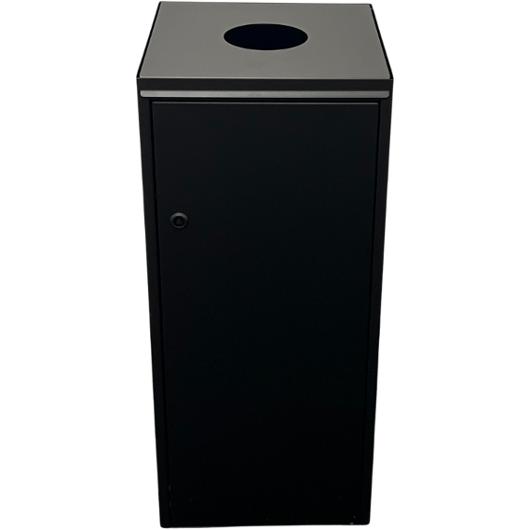 Elegant och robust avfallshantering med tyst stängning. Elegant och robust sorteringskärl med mjukstängande lock för tyst och behaglig användning. Locket har ett runt öppningshål. Kärlet är utrustat med ställfötter och en praktisk öppningsbar dörr, vilket medför ergonomiskt byte av säck. Dörren är utrustad med lås för ökad säkerhet. Dörrnyckel medföljer, samt kopplingssats för sammankoppling av flera kärl. Funkar perfekt att kombinera flera kärl på rad för olika avfall. Tillverkat i Sverige av återvunnet svenskt stål och pulverlackerat för hög hållbarhet och stilren finish. – Mått: D 36 x B 37 x H 83 cm – Vikt: 18,4 kg – Material: pulverlackat återvunnet svenskt stål – Färg: svart