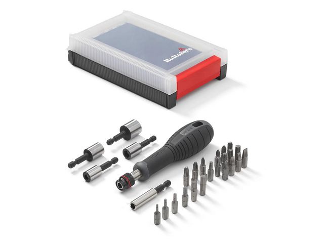 Set med korta bits och handtag i en praktisk plastlåda. Utvecklat för professionellt bruk tillsammans med hantverkare. Innehåller: Spårbits 3.5, 4.0, 5.5, 6.5, PH 1, 2 och 3, PZ 1, 2 och 3 Insex 2, 2.5, 3, 4, 5 och 6,5 mm Torx® T10, 15, 20, 25, 30, 40 och 45 Magnetisk hylsbits 6, 8, 10 och 13 mm 1st 60 mm bitshållare – Ergonomiskt handtag med ett säkert gummigrepp – Designad för kraft och precision – Standard 1/4″ bitshållare med snabbfäste och magnet – Handtag med rullstopp och upphängningshål – 29 delar