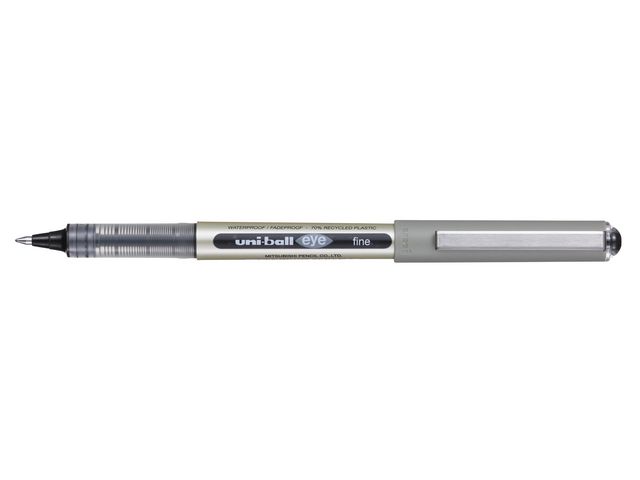 Kulspetspennan Uni-Ball Eye har ett unikt bläckflödessystem som ger jämn och enhetlig skrift från början till slut. Den här kulspetspennan har det unika bläckflödessystemet Uni-Flow som säkerställer att bläcket flyter jämnt och fint till sista droppen. Den här pennan är perfekt när du skriver något som ska presenteras. Uni-Ball Eye har en fin 0,7 mm-spets i rostfritt stål, vilket bidrar till exakt och snygg skrift. Den här kulspetspennan har vatten- och ljusbeständigt Super Ink™-bläck, som gör att texten håller och ser snygg ut länge. Bläcknivån visas i ett litet fönster så att du kan hålla koll på hur mycket bläck som finns kvar. Den här pennan har också en praktisk fickklämma och lock. – Linjebredd: 0,45 mm – Kula av hårdmetall – Fönster för bläcknivå så att det syns hur mycket bläck som finns kvar – Fickklämma och lock gör den enklare att bära med sig – Färg: svart – 70% återvunnen plast
