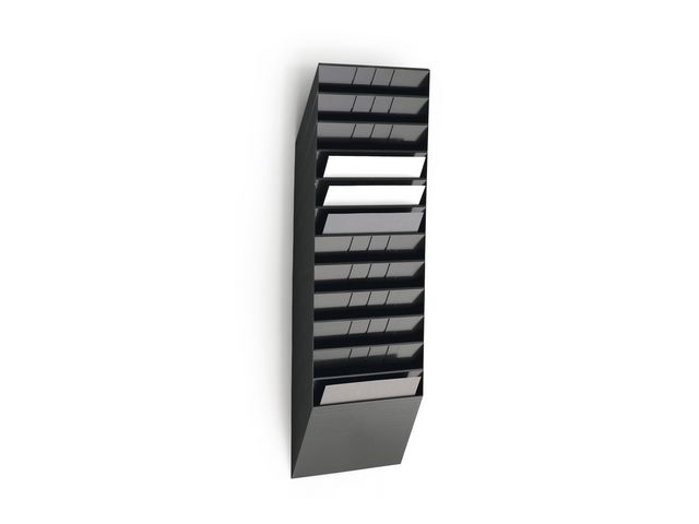Organisera mappar, tidskrifter eller dokument i snygg väggdisplay. Montera denna Durable Flexiboxx väggdisplay på en vägg för snabb organisering av dokument, tidskrifter eller andra A4-papper. Skapa ett utrymme för visning av tidskrifter eller ett snabbt arkiveringssystem för A4-dokument med denna väggdisplay från Durable Flexiboxx. Med tolv fack ger den här horisontella displayen snabb ordning på kontor och i väntrum, samtidigt som designen är enkel att installera. Installera den här Flexiboxx-väggdisplayen på några minuter i alla rum som har användning för extra arkivering eller tidskriftsförvaring. – Organisera pärmar, tidskrifter eller dokument – 12 separata fack för organisation – Monteras horisontellt i liggande format – Färg: Svart – Innerbredd: 348mm – Innerhöjd: 1045mm – Innerdjup: 24mm – Ytterbredd: 348mm – Ytterhöjd: 1045mm – Ytterlängd: 95mm