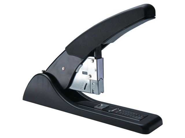 Lyrecos extra heavy-duty häftapparat är speciellt utformad för att hantera stora mängder ark. Blockhäftare med gummisida undertill för stabil häftning. Häftstädet kan justeras för att anpassas till flera olika häftklammers längd. Häftapparaten kan användas med många olika häftklammer beroende på hur många ark man behöver häfta: 23/14, 23/8, 23/10, 23/15, 23/17, 23/20, 23/23. Lyreco 23/17 klammer är (252247) – Gapdjup: 8,6 cm – Laddningskapacitet: 100 häftklammer i 23-serien. – Mått: HxBxL 19,5 x 9,5 x 31,7 cm – Maxkapacitet: 200 ark