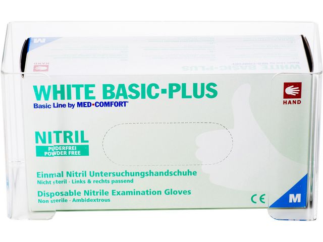 Handskhållare i stilren design för engångshandskar. Handskhållaren är tillverkad av heltransparent plexiglas av högsta kvalitet. Den är gjord för väggmontering. Med ett enhandsgrepp garanterar den användaren en snabb och enkel tillgång till nya handskar. Rymmer en ask. Bredd: 27,5 cm Höjd: 14,5 cm Djup: 10,5 cm Vikt: 0,25 kg