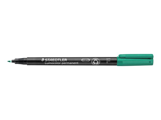 Lumocolor® permanent penna tillverkad av 97 % återvunnen pre-consumer plast, för användning på praktiskt taget alla ytor. Lämplig för overheadfilm. Även lämplig för användning på CD/DVD samt märkning på metall, plast, trä och andra icke-absorberande ytor. Utmärkt kvalitet, smutsavvisande och vattentät. Torkar på några sekunder, därför idealisk för vänsterhänta användare. Permanent, luktfritt bläck. PP skaft och hätta säkerställer lång livslängd. kan ligga utan hätta i dagar utan att torka ut. Flygsäker – automatisk tryckutjämning förhindrar att pennan läcker på planet. Pennfodralet är tillverkat av 97 % återvunnen pre-consumer plast, enligt ISO 14021 (dkaft, hätta och ända) Superb färgglans. Påfyllningsbar. Linjebredd Fin ca. 0,6 mm. – Permanent bläck – Med huv – Linjebredd: Ca 0,6 mm – Textärg: Grön – Färg pennkropp: Svart – Pre-consumer återvunnen plast 97%