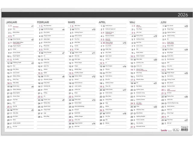 Ett halvår per sida. Med namnsdagar. – Format: 600×400 mm – Layout: Halvår/sida – Kalendarium: 2026-01-01 – 2026-12-31 – Innehåll: Helgdagar, Namnsdagar, Anteckningssidor, Årsplan/årsplaner – Antal sidor: 2 – FSC Mix