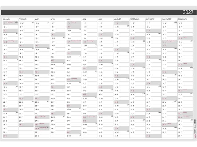 Hela året på en sida. Med plats för anteckningar. – Format: 980×680 mm – Layout: År/blad – Kalendarium: 2027-01-01 – 2027-12-31 – Innehåll: Helgdagar, Anteckningssidor, Årsplan/årsplaner – Antal sidor: 2 – FSC Mix