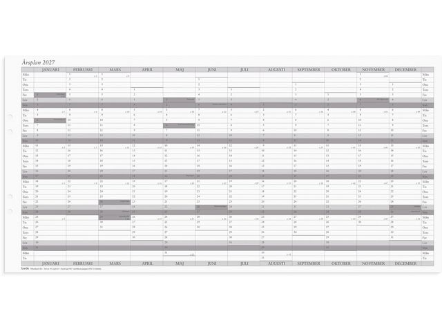 Kalenderblad som levereras som vikt till A4 i förpackning om 5 st. – Format: 600×297 mm – Layout: År/blad – Kalendarium: 2027-01-01 – 2027-12-31 – Innehåll: Helgdagar, Årsplan/årsplaner – Antal sidor: 1 – FSC Mix