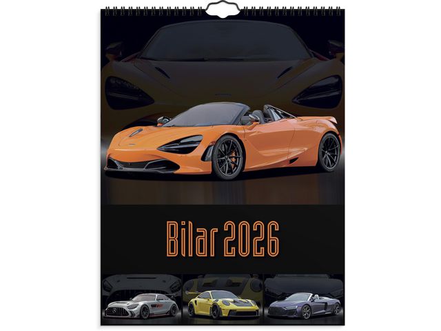 Foton på exklusiva sportbilar. En månad per blad. – Format: 295×390 mm – Layout: Månad/blad – Kalendarium: 2026-01-01 – 2026-12-31 – Spiralbunden – Innehåll: Flaggdagar, Helgdagar/aftnar, Namnsdagar, Temadagar/händelser – Antal sidor: 12 – FSC Mix