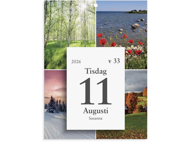 Följ året genom att riva av blad efter blad. Kalendern har ett väggplån som bakstycke med bilder på de fyra årstiderna och ett dagblock. Dagblocket har en vardag per blad och lördag och söndag på samma blad och är limbundet med klammerbaksida. – Format: 130×175 mm – Layout: Dag/sida – Kalendarium: 2026-01-01 – 2026-12-31 – Limbunden – Innehåll: Kyrkliga helgdagar, Flaggdagar, Helgdagar, Månfaser, Namnsdagar – Antal sidor: 318 – FSC Mix