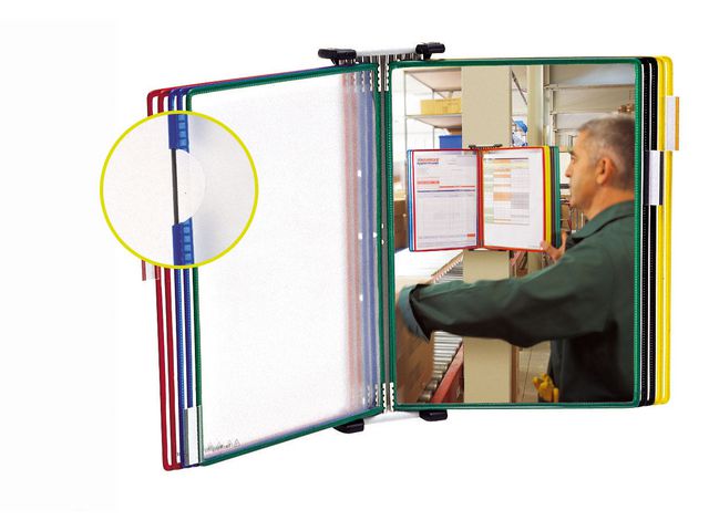 Väggställ i ljusgrå metall av hög kvalitet. För snabb och enkel tillgång till information. Gör viktig information synlig där den behövs! Robust och lätt att montera. Levereras med 10 ramar av PVC i blandade färger. – 5 clip-on indexflikar medföljer – PVC-plast