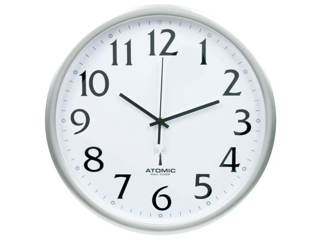 Praktisk klocka med snygg och stilren design! Med denna klocka slipper du ställa in tiden själv. Med en inbyggd mottagare som tar emot en radiosignal har klockan alltid korrekt tid. En radiokontrollerad klocka ger dig en mycket exakt tid som styrs av ett atomur (gångnoggrannhet ± 1 sekund på 1 miljon år). Urverken innehåller en radiomottagare som avkodar tidssignalen (långvåg 77,5 kHz) och justerar tiden. Sändarens räckvidd är ca 2000 km, d.v.s. norr om Umeå (i Sverige) är den ej tillförlitlig. – Svepande sekundvisare – Silverfärgad plastram, vit urtavla och glaslins – Diameter 35cm – Drivs med ett AA-batteri (medföljer ej) – Garanti: 1 år