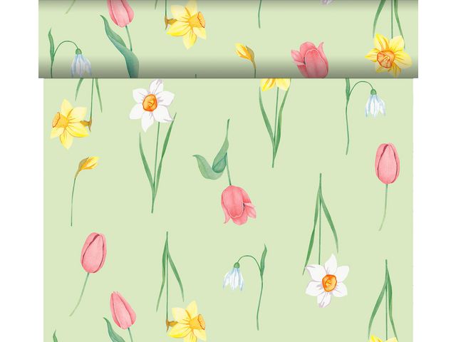 Bordsvepa med vårblommor på ljusgrön botten. Bordsduken är smart perforerade var 120 cm, vilket gör den perfekt för både korta och längre bord – enkelt och flexibelt för alla tillfällen. Komplettera gärna med fler artiklar i samma serie för en komplett dukning. – Mått: 0,4 x 24 m – Material: Dunicel Bio – 3-lags – FSC Mix