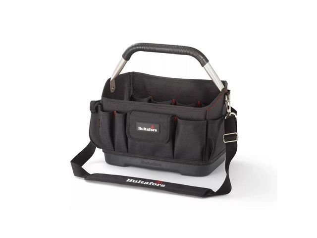 En öppen verktygsväska i textil, designad för ergonomiskt bärande. Med 25 fickor och verktygshållare, inklusive en sidoficka med dragkedja för säker förvaring och ett fäste för mätband. Verktygsväskans baksida har en ergonomisk kurvatur som ger ditt ben mer rörelseutrymme och gör att du inte behöver hålla ut väskan lika långt från kroppen när du går. Den har en robust gjuten botten som förhindrar att väskan välter, skyddar botten mot fukt, smuts och slitage – och håller dina verktyg torra. Väskan är tillverkad i extremt slitstark ballistisk polyester – 1680 denier – för maximal slitstyrka och livslängd. Väskans fram- och baksida har olika höjd, vilket ger dig bra överblick och åtkomst framifrån och mer stöd för dina verktyg på baksidan. Väskan har ett stort mittfack med fickor och verktygshållare längs sidorna. Det finns medelstora fickor med lock och dragkedjor för säker förvaring av känslig utrustning. Den har också hållare för mätband, pennor, nycklar och elastiska öglor för mindre verktyg. En av sidofickorna innehåller ett regn- och dammskydd tillverkat av ripstop-tyg som skyddar väskan och innehållet mot dåligt väder, damm och smuts. Handtaget är extra högt, vilket gör att man inte behöver böja sig så långt för att lyfta väskan. Handtaget har ett långt gummiöverdrag som gör att du kan greppa bekvämt hela vägen samt att det går att balansera väskan även med en ojämn viktfördelning. Handtaget kan fällas ner för enkel åtkomst och överblick. Den justerbara axelremmen har en extra lång vaddering med en högfriktionsyta för bekväm och enkel bärning. – Mått: 42 x 26 x 27 cm – Maxvikt: 60 kg – 25 fickor – Välvd, bekväm baksida – Gjuten botten – Regn- och dammskydd ingår