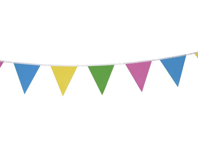 Låt denna pappersgirlang sätta tonen för en minnesvärd och färgsprakande upplevelse! Förhöj feststämningen med vår pappersgirlang komplett med vitt snöre. Girlangen består av 18 vimplar i färgerna blå, gul, grön och rosa, med tryck på båda sidor för en genomtänkt och festlig design. Varje vimpel mäter 16×18 cm, vilket ger en imponerande och färgglad dekoration till din fest eller tillställning. – 4m – 16x18cm – Papper – FSC 100%