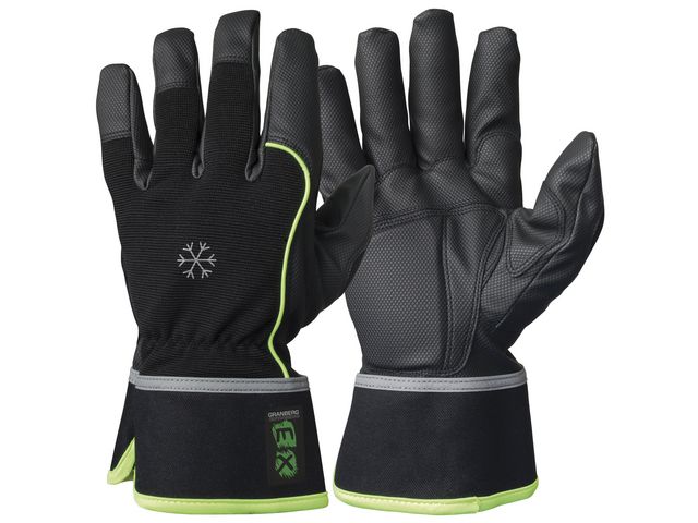 Vinterhandskar EX by Granberg i syntetiskt skinn. Lämpliga för grövre arbete i kyla såsom anläggningsarbete och godshantering. Montagehandskar i MicroSkin Shield-material med membran i ProTex och ovanhand i spandex. Med innerfoder som skyddar mot både kyla och fukt. Handskarnas membran gör att handsken får ventilerande egenskaper för att undvika att handen blir fuktig och därmed kall. Handskarna har god passform, kardborreknäppning, är smidiga och ger utmärkt greppförmåga. Kan maskintvättas och dropptorkas. Lämpliga till medeltungt till tungt arbete inom montering, transport, underhåll, industri, skogsarbete och anläggning i kalla och fuktiga miljöer. – Godkänd enligt: EN 420:2003 + A1:2009, EN 511:2006, EN 388:2003, EN 388:2016+A1:2018 – Skyddskategori: II – Material innerhand: MicroSkin Shield – Material ovanhand: spandex/polyester – Foder: syntetfoder/ProTex membran – Fodertyp: helfodrad – Grepp: torrgrepp, våtgrepp – Längd: 21-24 cm – Färg: svart, grå – Storlek: 11 – CE-märkt