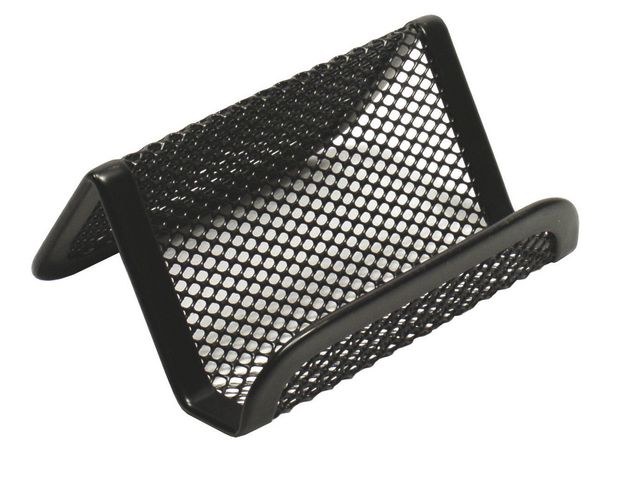 Snyggt ställ i metall för exempelvis din mobil eller visitkort. Den här snygga hållaren, som är tillverkad av tåligt stål, är idealisk för användning på kontoret eller på mässor. För visitkort, mobilen etc. i silvermetall, liten nog att rymmas på skrivbordet. – Modern och hållbar nätdesign – Perfekt för att användas på kontoret – Rymmer flera visitkort eller mobilen – Färg: Svart – Mått: 6 x 10 cm