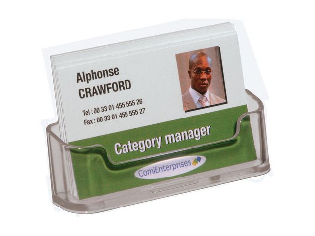 Visa upp dina visitkort enkelt och elegant! Visitkortsställ av transparent polystyrenplast som kan hålla ca 50 kort. Har en ficka som har en ca 1,7cm bred ficka. – Mått (BxHxD): 96x50x35mm – PS-plast