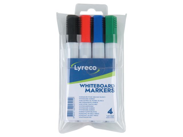 Penna med cap off-bläck, vilket innebär att whiteboard-pennan kan ligga en kortare tid utan huv och ändå gå att skriva med. Pennans bläck är fritt från xylen och kan enkelt torkas bort med en torr trasa. Med pennkropp och huv av PP-plast. Praktisk förpackning med alla grundfärger. – Icke permanent bläck – Med huv – Rund spets – Spetsbredd: 1,5-3mm – Textfärg: Svart, röd, blå, grön – Färg pennkropp: Vit