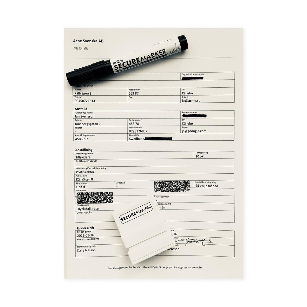 Secure marker har extra svart bläck som döljer känslig information. Texten eller det som ska döljas stryks över och den blir oläslig. 4,0 mm rak spets, svart.