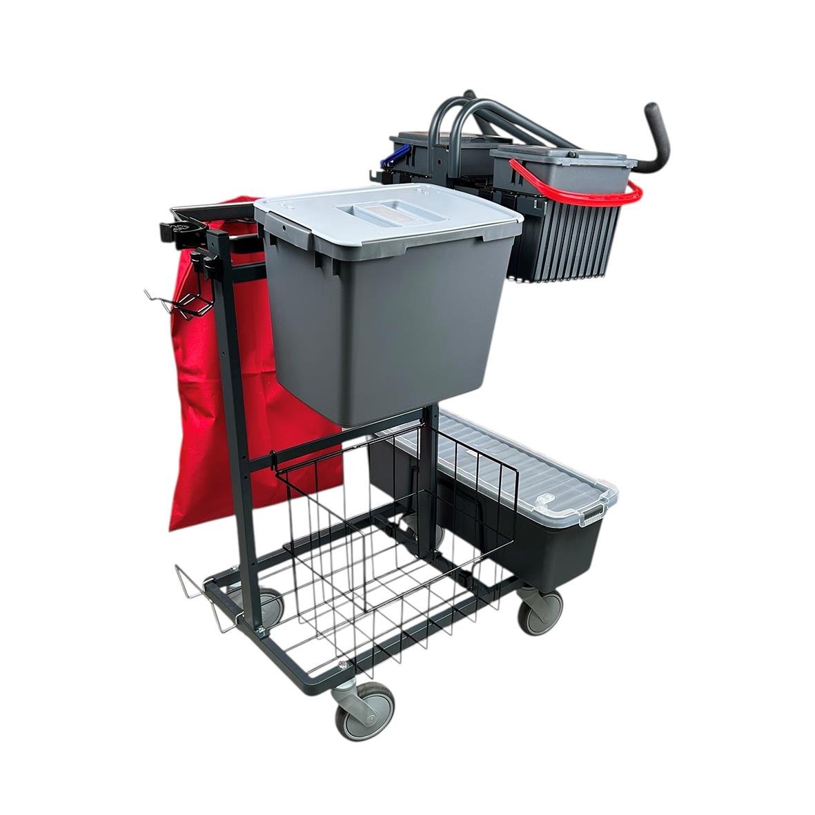Städvagn Alloffice Midi Gen2. Det här är en liten kompakt städvagn som har utrustats med anpassade funktioner för städning med förimpregnerat material. Utrustad med en 25L back med plats för tex impregnerade moppar (en back rymmer ca 30st 60cm moppar). D