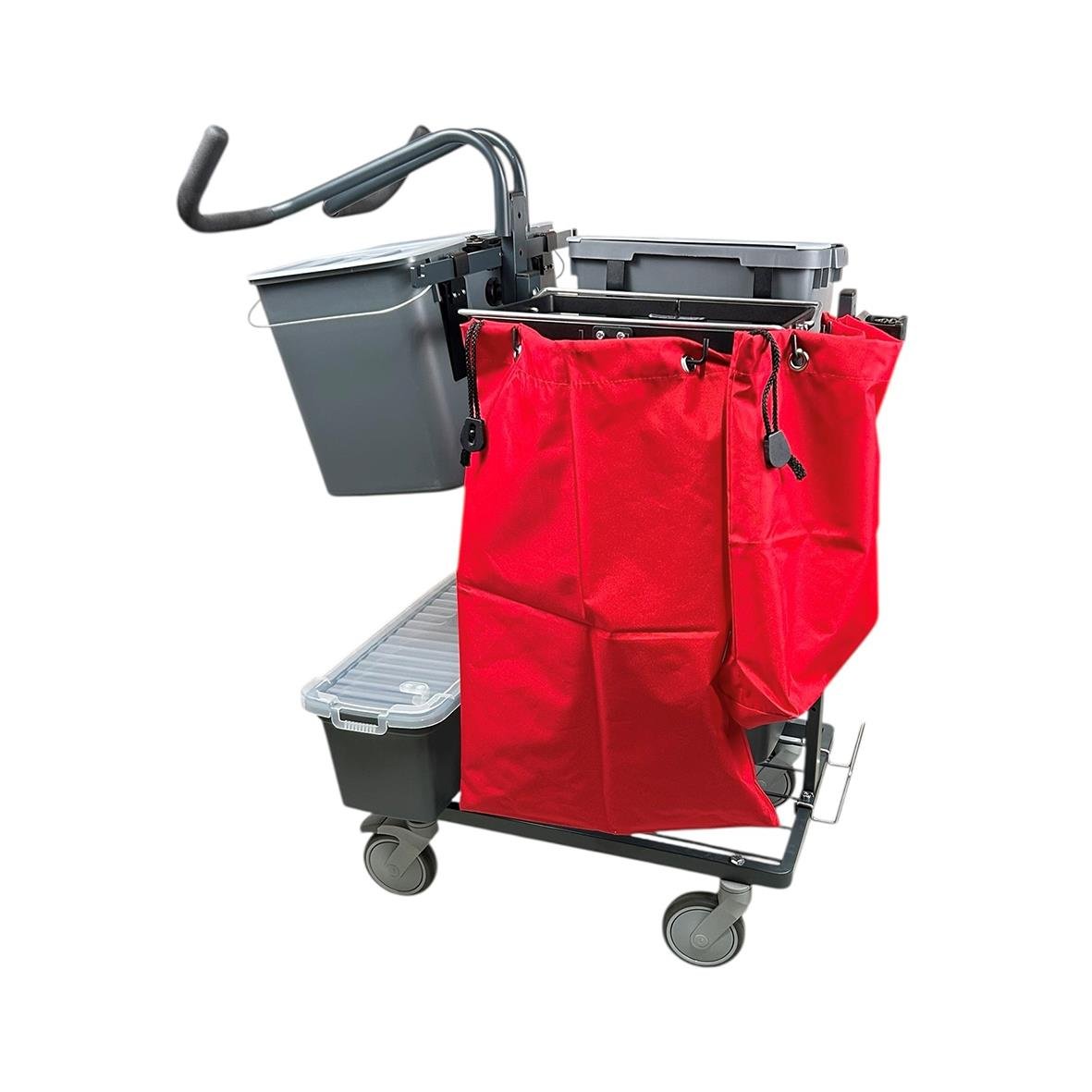 Städvagn Alloffice Midi Proffs Gen2. Det här är en kompakt städvagn som har utrustats med anpassade funktioner för städning med förimpregnerat material. Trots sitt kompakta utförande har den mycket hög kapacitet att bära material för stor objekt. Utrusta