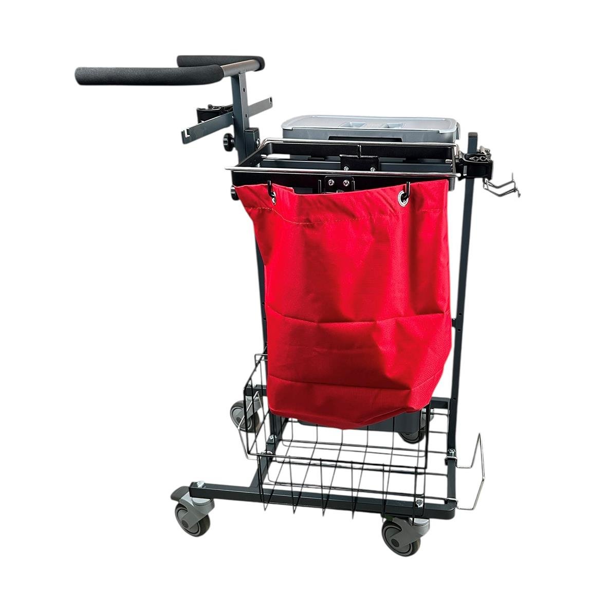 Städvagn Alloffice Mini Gen2. Det här är en liten kompakt städvagn som har utrustats med anpassade funktioner för städning med förimpregnerat material. Med två 25L backar finns gott om plats för impregnerade moppar och dukar (en back rymmer ca 30st moppa