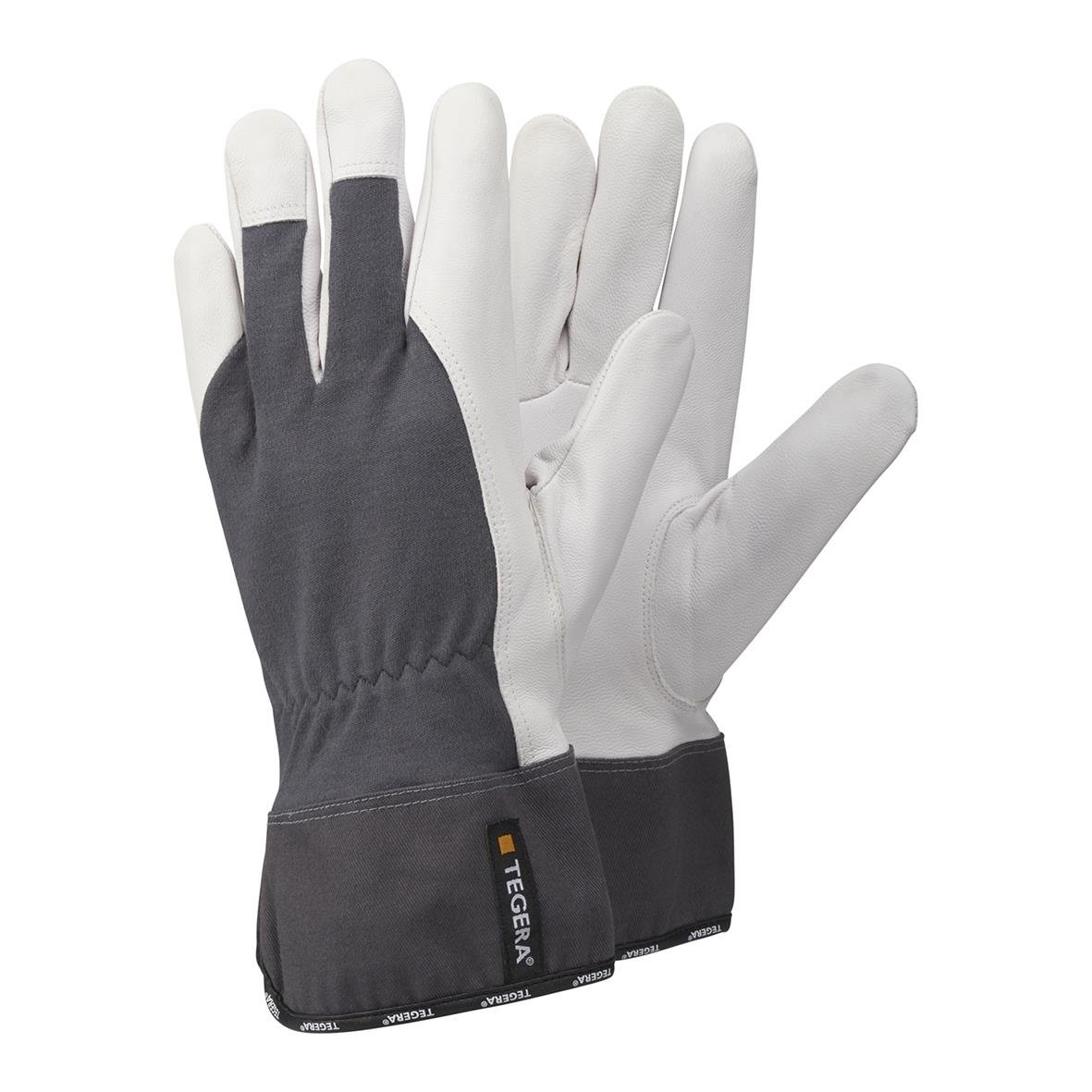 Montagehandske Tegera 6751 Getnarv 12. Läderhandske, ofodrad, 0,7-0,8 mm getnarv, bomull, Cat. II, förstärkt pekfinger, förstärkta fingrar och tumme, för monteringsarbeten.