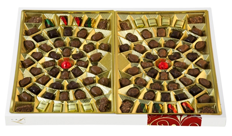 En ask fylld med 100 härliga praliner; gräddtryffel, kanelpraliner, mandelnougat m fl. Mixad sortering med mörk- och mjölkchoklad.