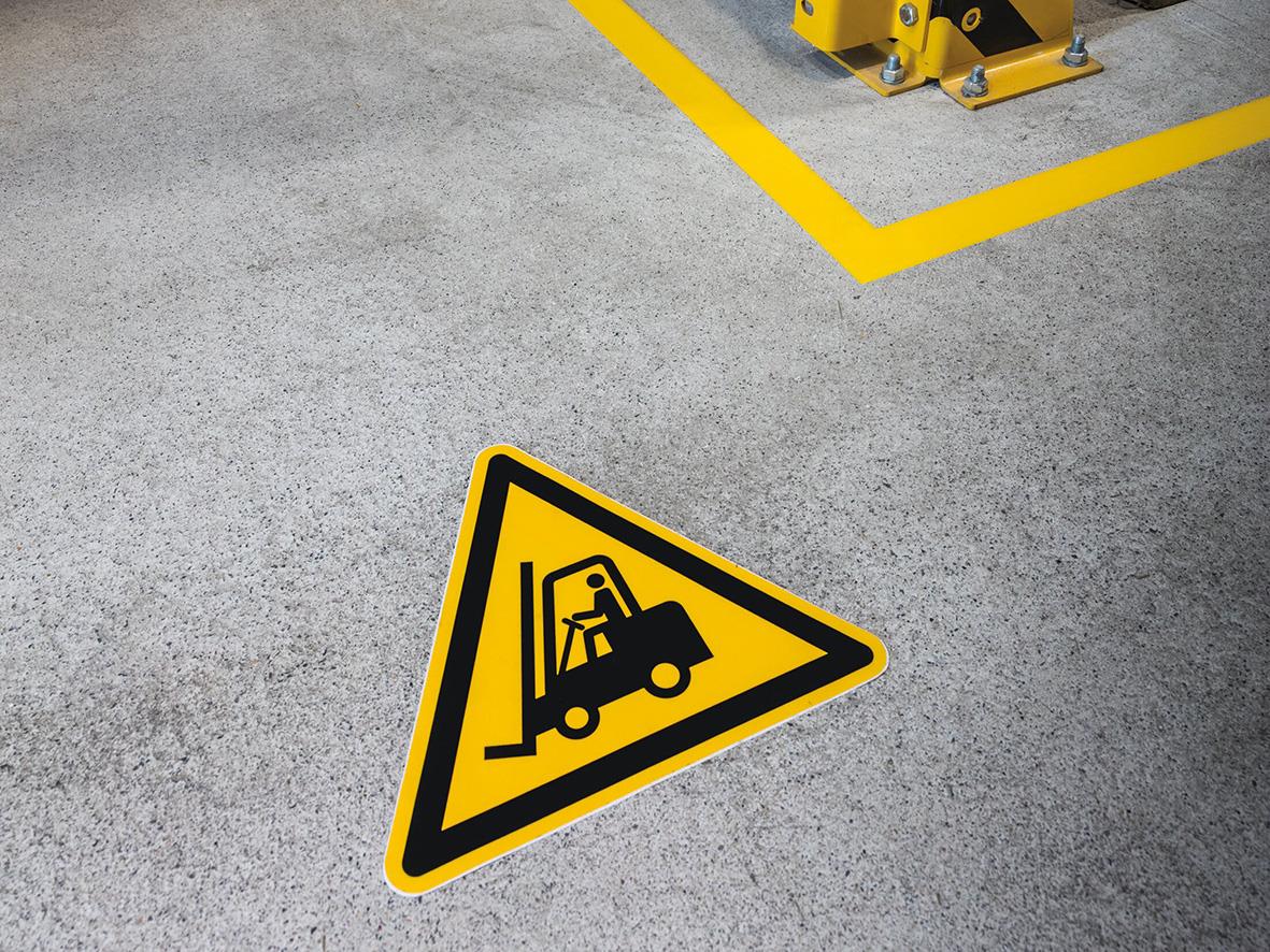 Självhäftande stor golvdekal "Varning för truck" upplyser tydligt besökare och personal att se sig noga för när de rör sig i området för att minska risken för olyckor. Fäster på rena och torra betonggolv. Slitstark och tålig med halkskyddsgrad R9 i enl