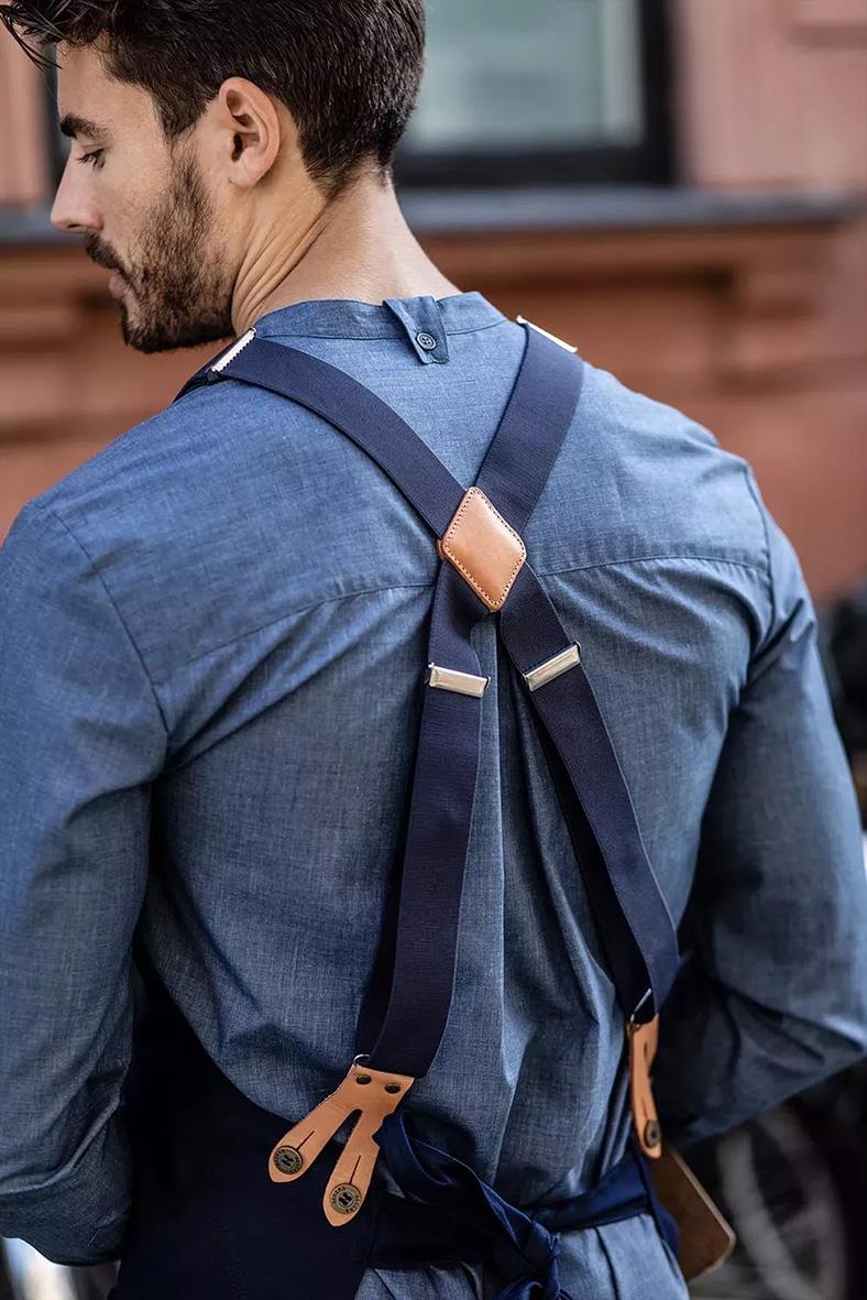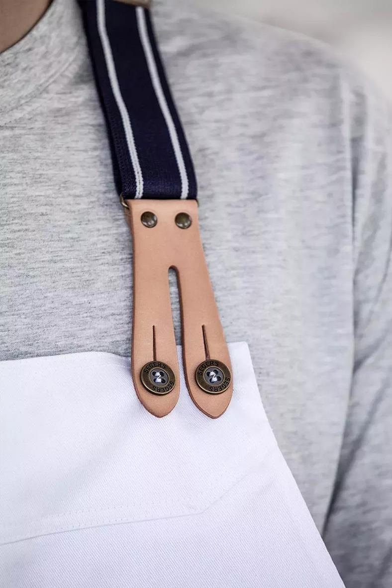 Resårhängsle Segers 0568 Marin/Vit S/M. Justerbara resårhängslen. S/M (ca 54-80 cm), L/XL (ca 68-108 cm). Passar förkläde 4078 - Resår/ Läder - Hängslen som fästs med skinntoppar och metallknappar - Plockas ur vid tvätt - Resår-kvalitet