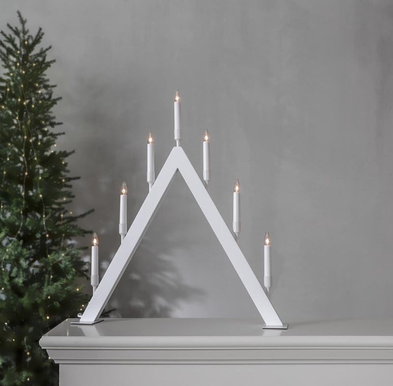 En väldigt fin och stämningsfull adventsljusstake i A-form. Vitmålad träbas med upphöjda ljuskoppar, ger ett elegant och enkelt uttryck till både hemmet och den offentliga miljön. Sprider ett behagligt ljus med sin 7 ljuskällor. Placera i ett fönster elle