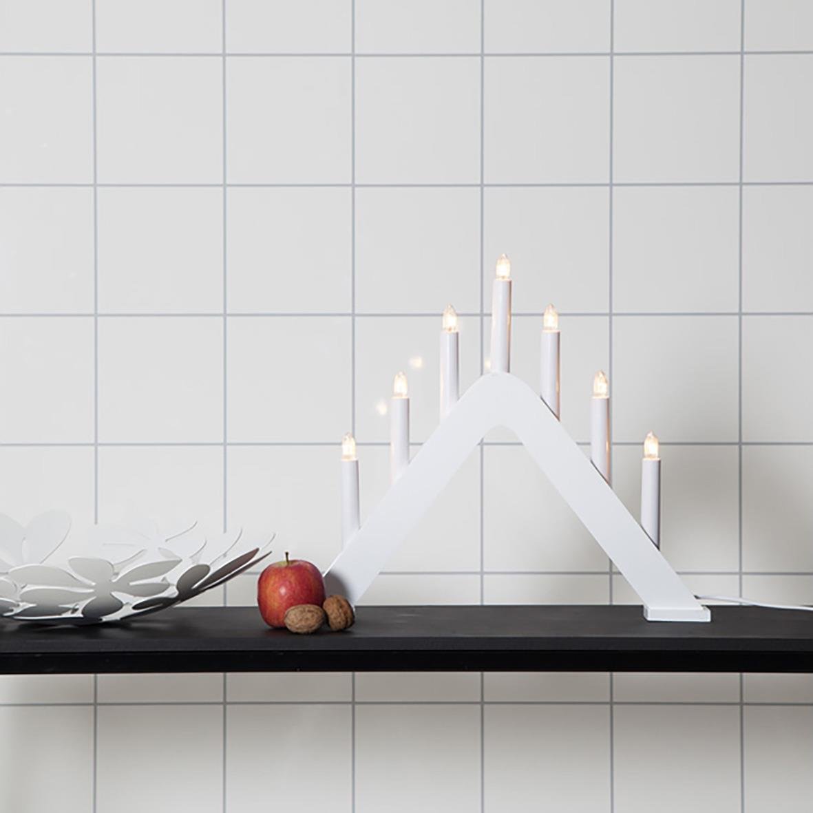 Adventsljusstake tillverkad i trä, målad i vitt. Klassisk ljusbild för att skapa den perfekta julstämningen i fönster eller på en skänk.