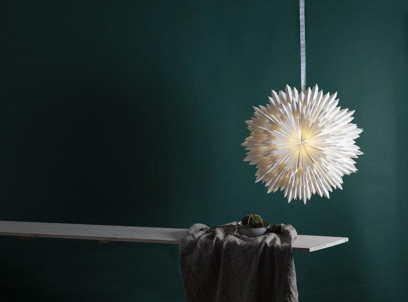 Modern vit pappersstjärna som är tillverkad av tre lager veckat papper. Konturen är lite ojämn för en vintrigare känsla. Ett elegant band ingår för att lättare kunna hänga upp stjärnan. Kan hängas både i fönster och mot en vägg. Mått B x H x D: 70 x 70 x