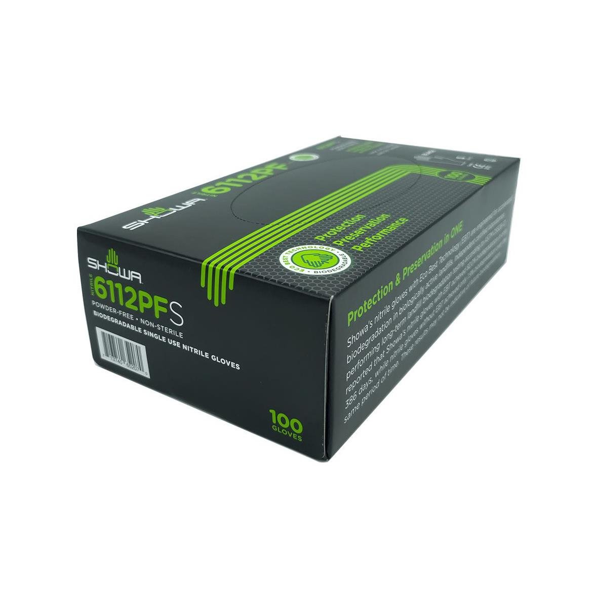 Engångshandske Showa 6112PF Nitril Svart S. Den mångsidiga, biologiskt nedbrytbara engångshandsken 6112PF prioriterar känslighet och fingerfärdighet. Den 0,10 mm tjocka nitrilen är också vattentät och ger extrem komfort under långa perioder av användning