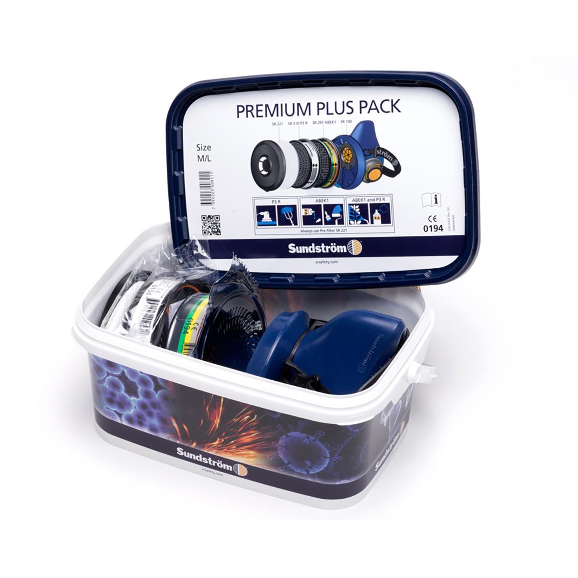 Halvmask Sundström Premius Plus Pack. - 1 st halvmask SR 100 M/L - 1 st partikelfilter SR 510 P3 R - 1 st gasfilter SR 297 ABEK1 - 5 st förfilter SR 221 - 1 st provningsrondell, - 1 st förfilterhållare, - 1 st rengöringsservett och bruksanvisning med skö