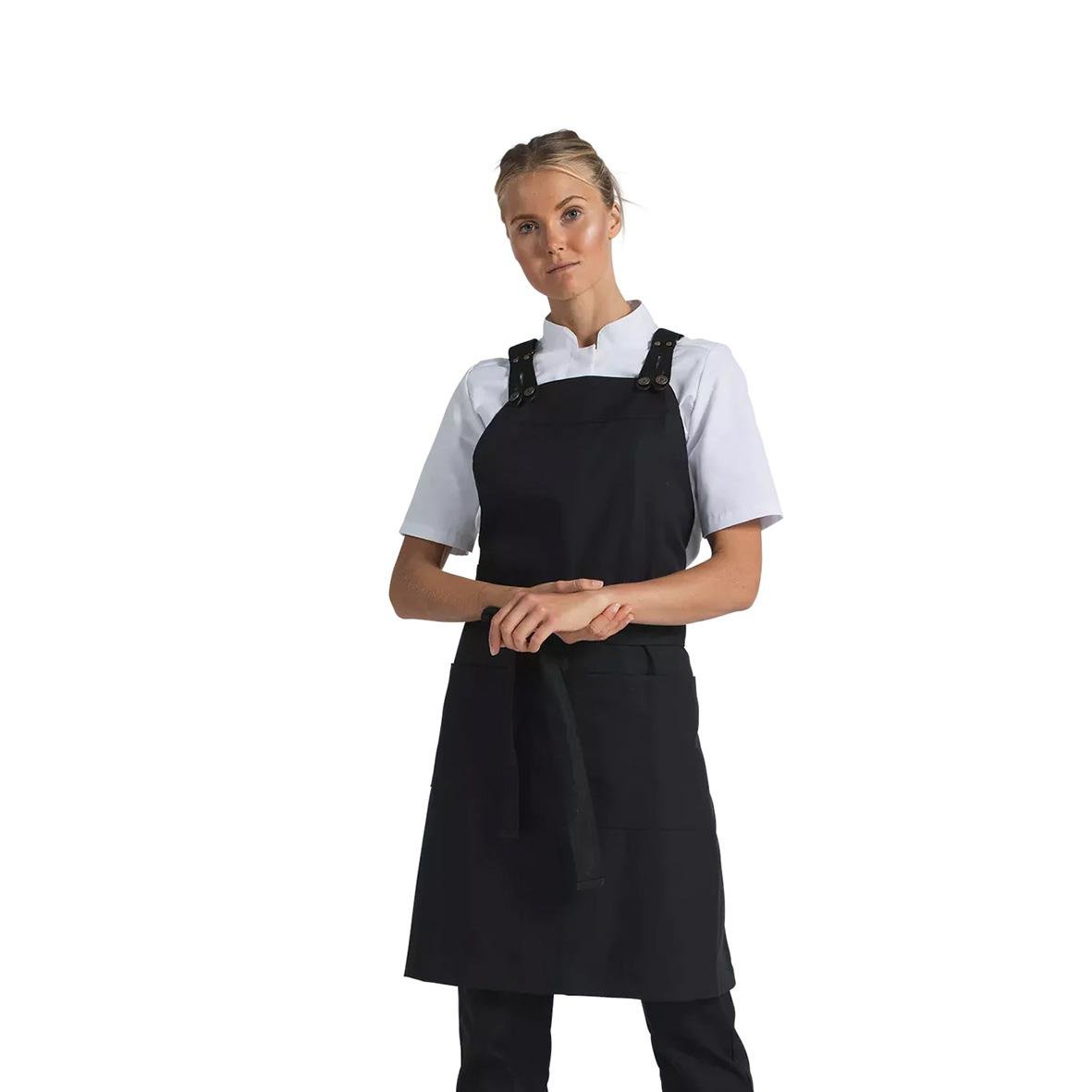 Bröstlappsförkläde med resårhängslen och dubbel ficka framtill. Resårhängsle (0568) köps separat.