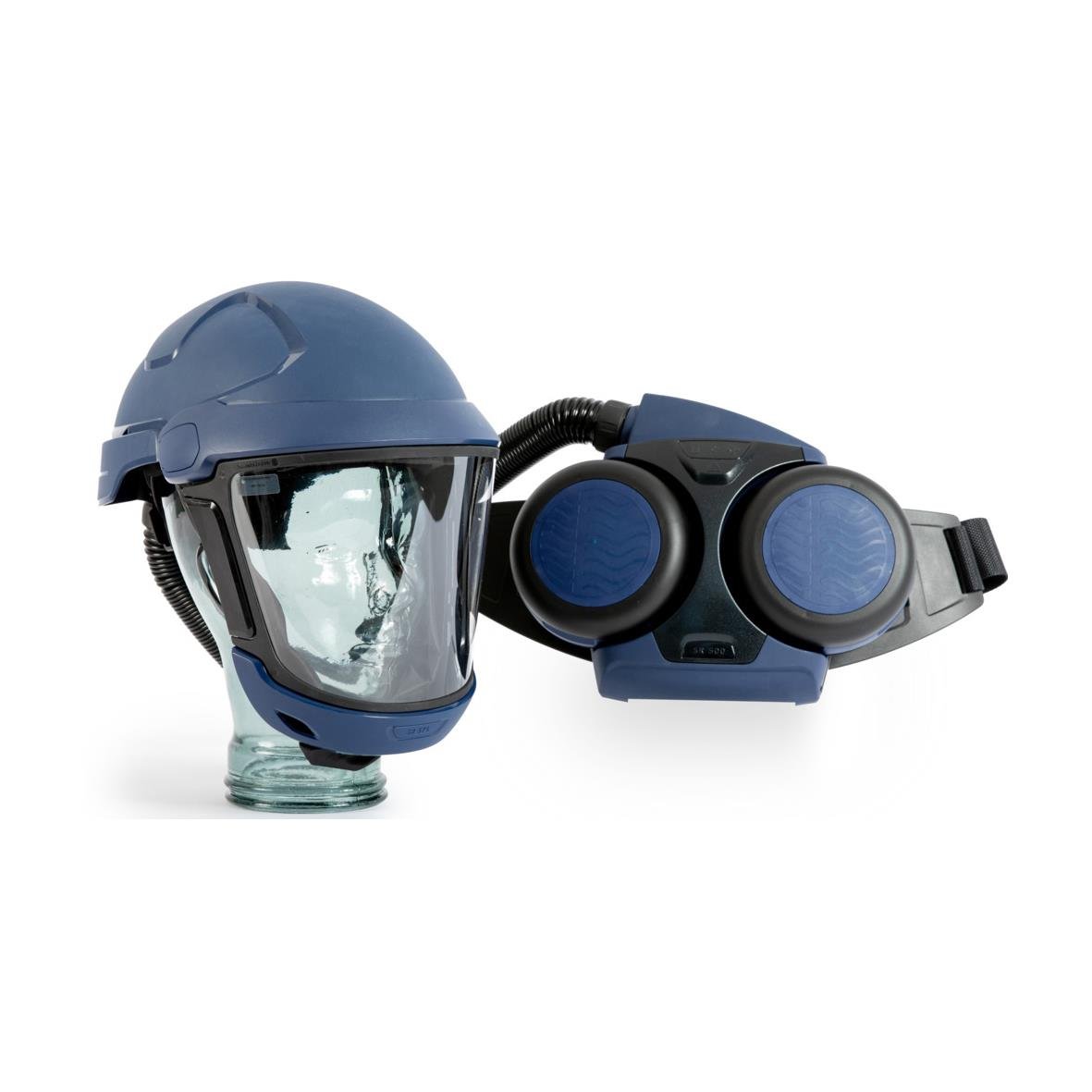 Paket med fläktenhet SR 500 och skyddshjälm med visir SR 575. Innehåll: fläktenhet SR 500, skyddshjälm med visir SR 575, standardbatteri, batteriladdare SR 513, bälte SR 508, 2-pack partikelfilter SR 510 P3 R, 2