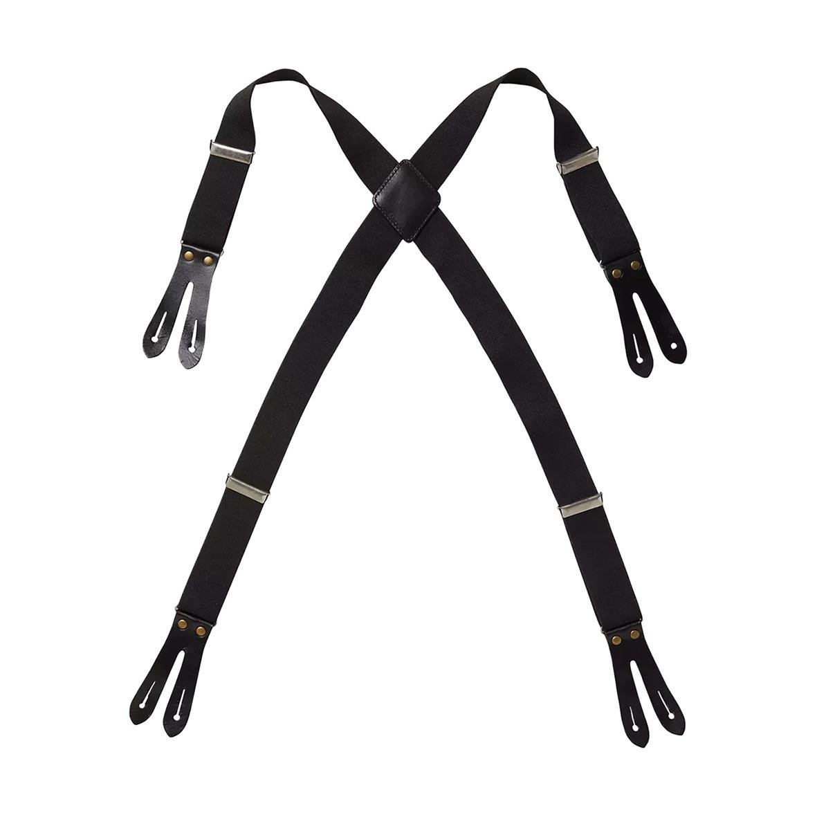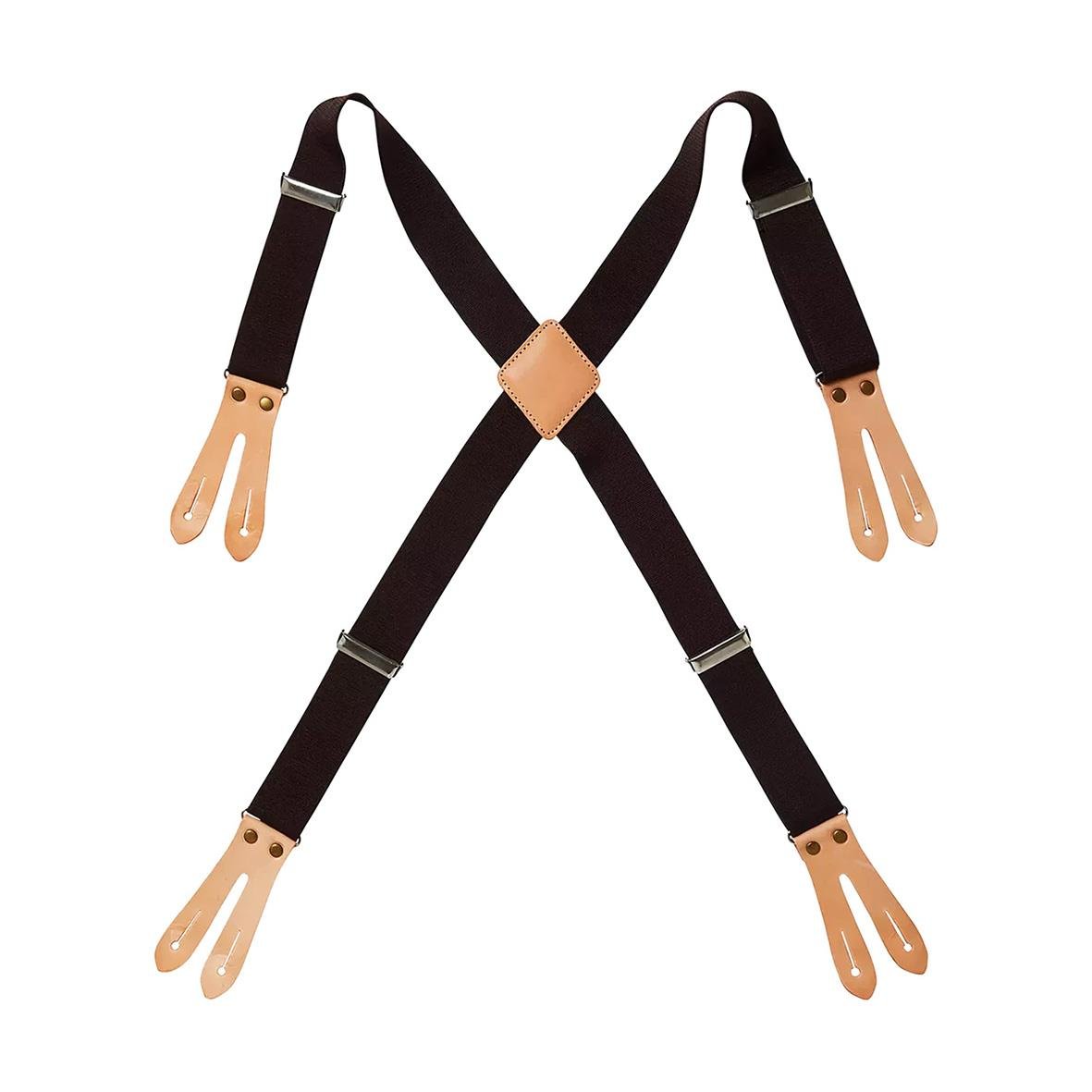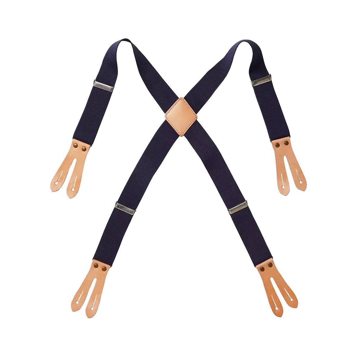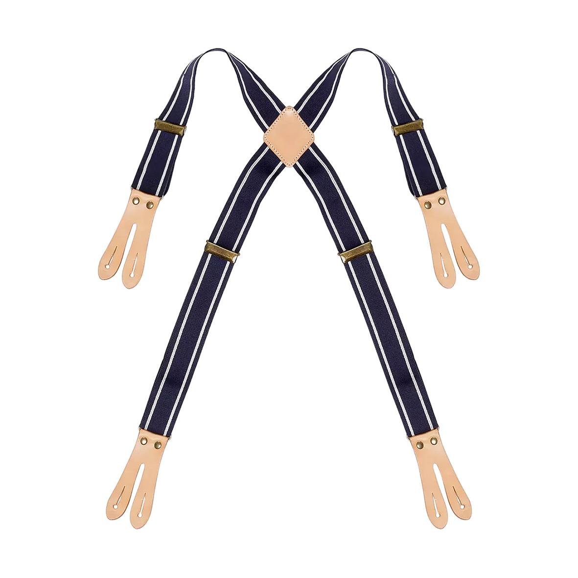 - Hängslen som fästs med skinntoppar och metallknappar