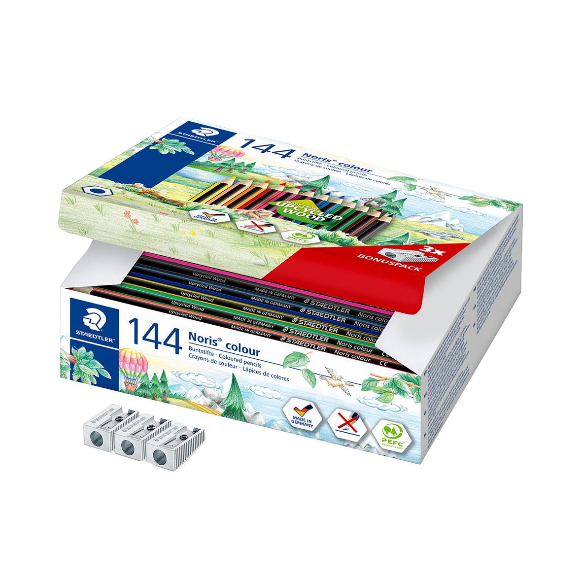 • Innehåller 144 färgpennor i 12 blandade färger samt 3 metallvässare.